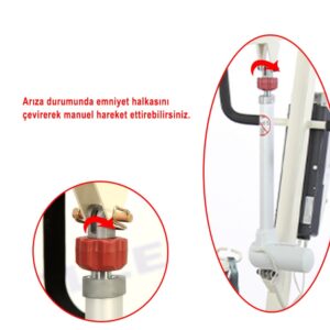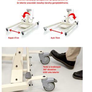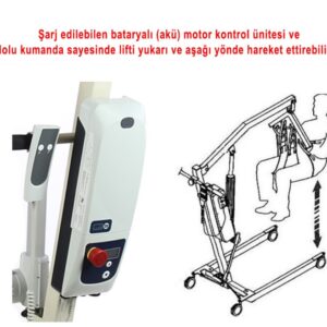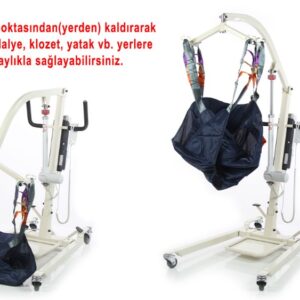Ürün Açıklaması ve Kullanım Alanı: Fırın boya çellik şaseden imal edilmiştir. Motor kontrollü hasta kaldırıp – indirme özelliği. Şarj edelibilir bataryası sayesinde kablosuz kullanım. Transfer zorluğu yaşayan engelli, yaşlı, kilolu ve yatalak hastaların yataktan alınması, tekerlekli sandalye veya başka bir yere transferin kolaylık sağlar. Demonte özelliği ile yer kaplamaz. İç ve dış mekânda kullanılabilir.