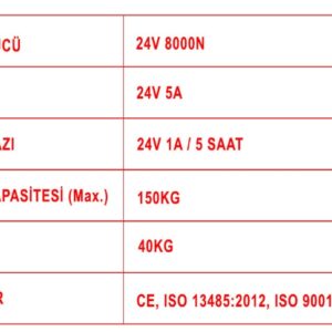 Şarj Aleti: 24V-1A şarj aleti / 5 saat Şarj Süresi